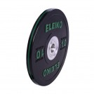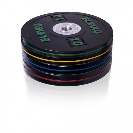 Для легкой идентификации веса диск весом 10 кг имеет цветную полосу по внешней окружности диска и выпуклые цветные надписи зеленого цвета из палитры олимпийского стандарта.