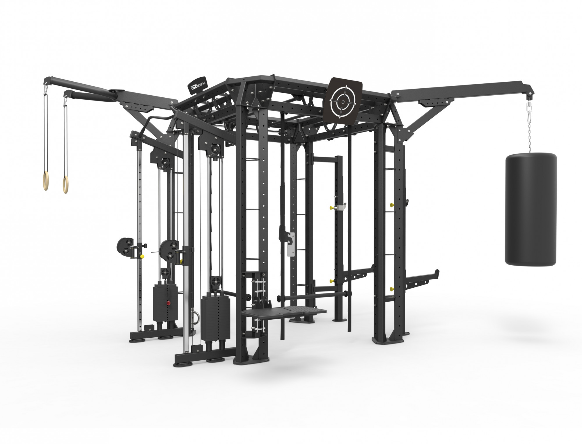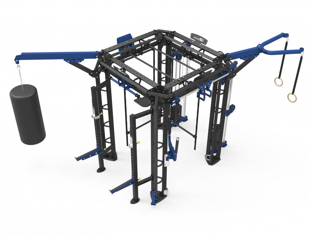 Стойка с боксёрским мешком, турник с кольцами, стойка для приседаний, кроссовер (тросовый тренажёр), подвижный турник для подтягиваний, баскетбольный щит, брусья и другие модули