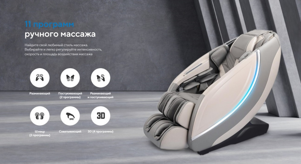 Интеллектуальная система автоматически сканирует тело, определяет рост, вес и настраивает массажные механизмы под индивидуальные параметры пользователя.