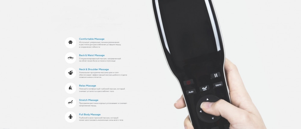 Каждая программа разработана в соответствии с массажными техниками и легко переключается с помощью пульта.