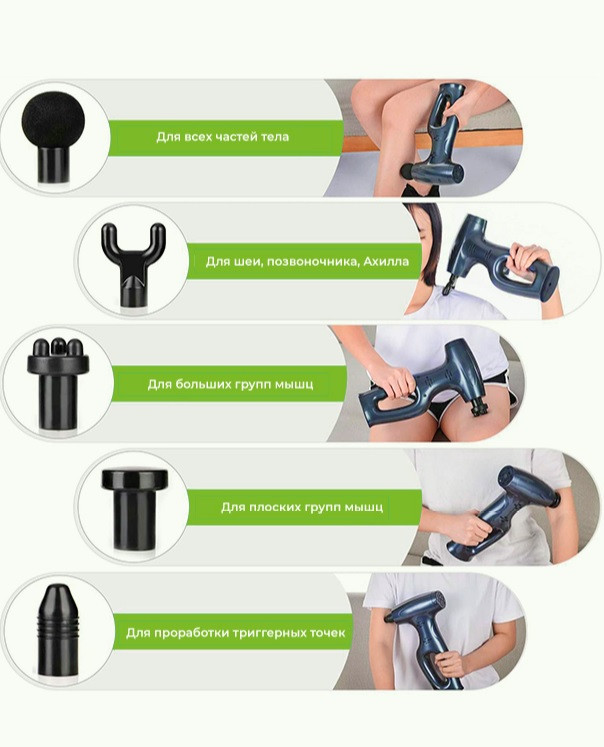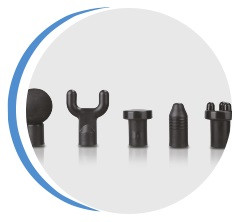 С помощью пяти сменных массажных насадок (мячика, вилки, плоской насадки, пулевидной насадки и розетки), которые входят в комплект, Вы можете настроить свой массаж для определенной группы мышц.