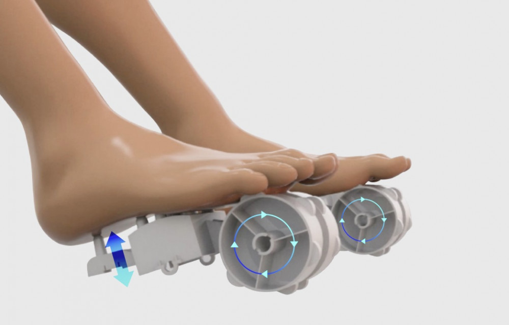 Ролики для массажа стоп, которые вращаются вдоль стопы, дополняются массажем аэроподушек. Когда подушки надуваются, ноги прижимаются к вращающимся роликам, тем самым увеличивая интенсивность массажа.