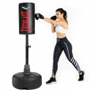 Боксерская напольная груша имеет цилиндрическую форму диаметром 35 см х 65 см. Она также регулируется по высоте с максимальной высотой мешка 173 см, что позволяет адаптировать тренировку под индивидуальные потребности.