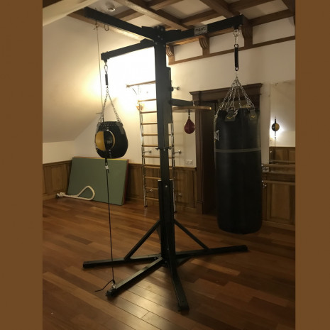 Напольная конструкция для боксерских мешков включает в свою комплектацию регулируемую платформу Speed Bag, щит которой диаметром 60 мм выполнен из массива сосны толщиной 40 мм. В комплект поставки входит поворотный механизм. Предусмотрено крепление под растяжку Double End. Для фиксации конструкции к полу используются анкерные крепежные болты (не входят в комплект).