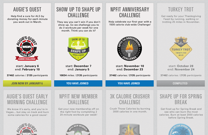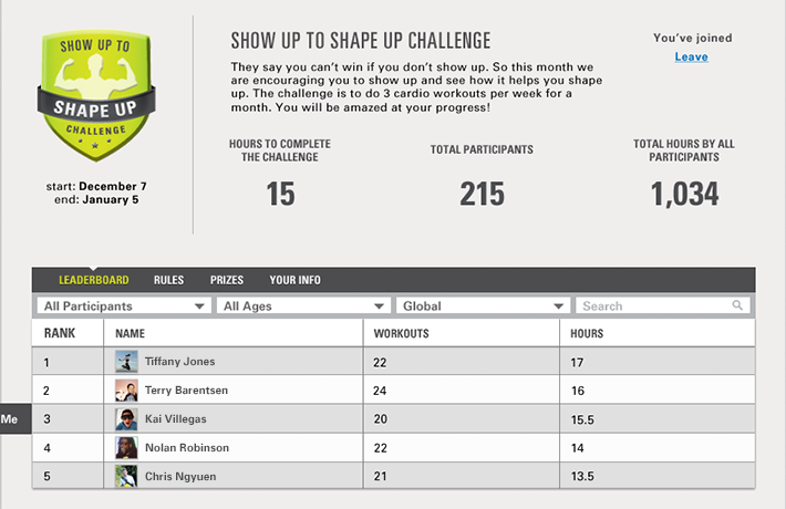 Проверка на прочность Ничто не заставит человека двигаться так, как небольшое дружеское соревнование. Теперь все члены Вашего клуба смогут ставить перед собой задачи, генерируемые с помощью данных об активности всех клиентов, занимающихся на Ваших тренажерах, приложением или даже их любимыми системами отслеживания активности вне стен клуба.