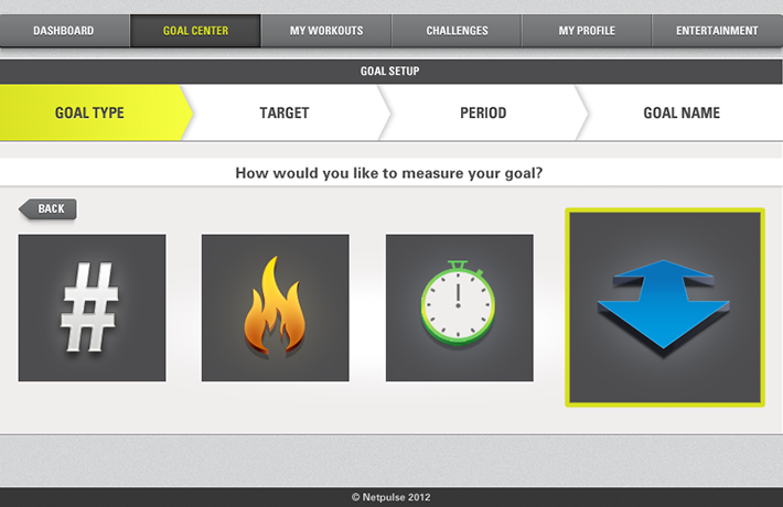 Цель Благодаря NetpulseOne ставить перед собой цели стало проще. Количество калорий, время, расстояние устанавливаются всего в несколько кликов. Независимо от тренажера или способа отслеживания результатов, каждый достигнет поставленной перед собой задачи.