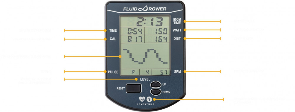 Bluetooth монитор Fluid контролирует все необходимые параметры вашей тренировки - нагрузку в ваттах, калории, дистанция и количество гребков в минуту. Монитор автоматически отображает уровень сопротивления, который вы установили с помощью регулятора на гребном тренажере. Вы также можете подключиться к фитнес приложениям, таким как Fluid Connect, Regatta, Asensei, EXR и Kinomap, используя Bluetooth.