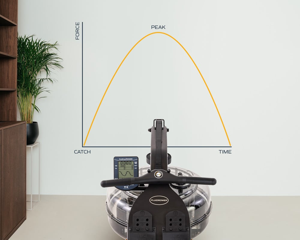 График распределения нагрузки является уникальной особенностью Bluetooth монитора Fluid. Этот график показывает ваш гребок в реальном времени. Вы можете использовать эту информацию для совершенствования вашей техники гребли. Чем лучше ваша техника, тем больше вы получаете от тренировки! На самом деле, идеальный гребок состоит из шести этапов, формирующих одно плавное, повторяющееся циклическое движение.