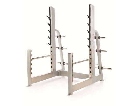 Держатели для штанги отрегулированы по высоте так, чтобы обеспечить полный диапазон движения и безопасно положить штангу. На стойках расположены держатели для дополнительных дисков.