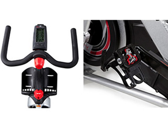 Двухсторонние педали с надежными SPD-креплениями позволяют заниматься на велотренажере как в специальной спортивной обуви, предназначенной для велоспорта, так и в обычной обуви для фитнеса.