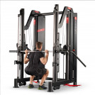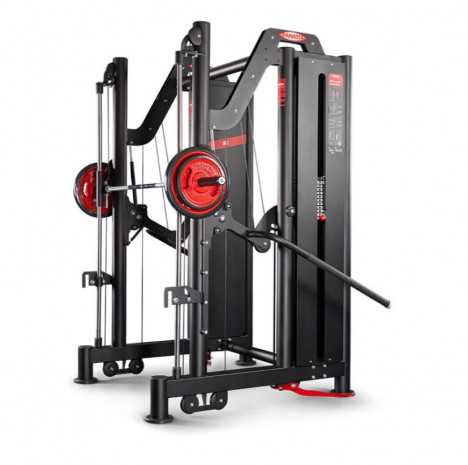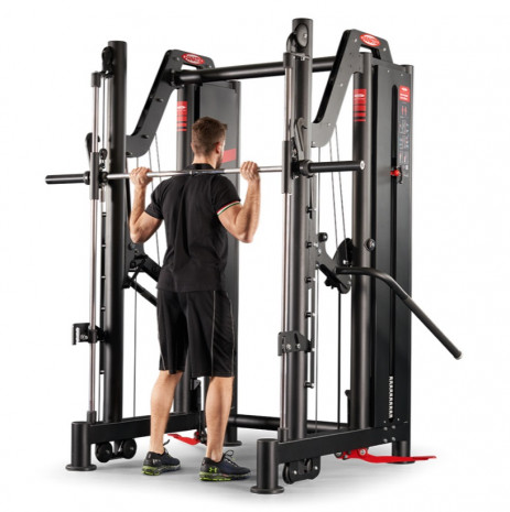 Этот тренажёр является усовершенствованной версией классического тренажёра «Смит». Его отличительная особенность — две независимые направляющие, которые обеспечивают полную безопасность во время тренировок без использования блинов. При этом предусмотрена возможность тренировок с блинами, максимальная нагрузка при этом составляет 430 килограммов. Основные характеристики: Два независимых весовых штабеля. Штанга с регулировкой по высоте, имеющая 7 положений. Два регулируемых по высоте крючка безопасности. Система противовеса для смещения съёмной штанги. Безопасность обеспечивается системой рычагов с гидравлическим демпфером, который позволяет безопасно поднимать груз. Активация системы осуществляется простой педалью, расположенной сбоку.