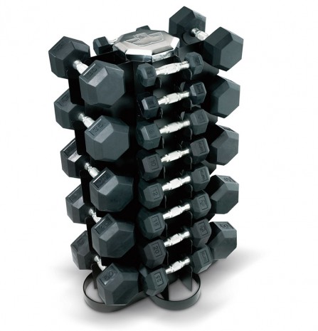 На четырехсторонней вертикальной стойкепомещаются любые 13 пар гантелей весом от 1 до 25 кг.