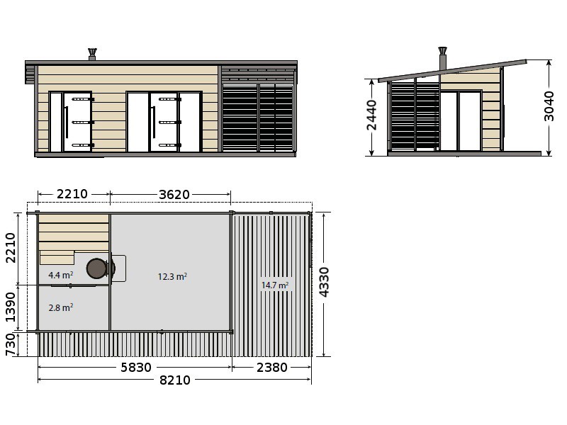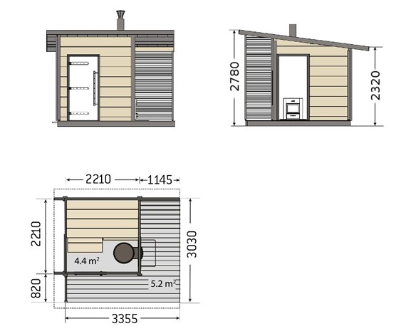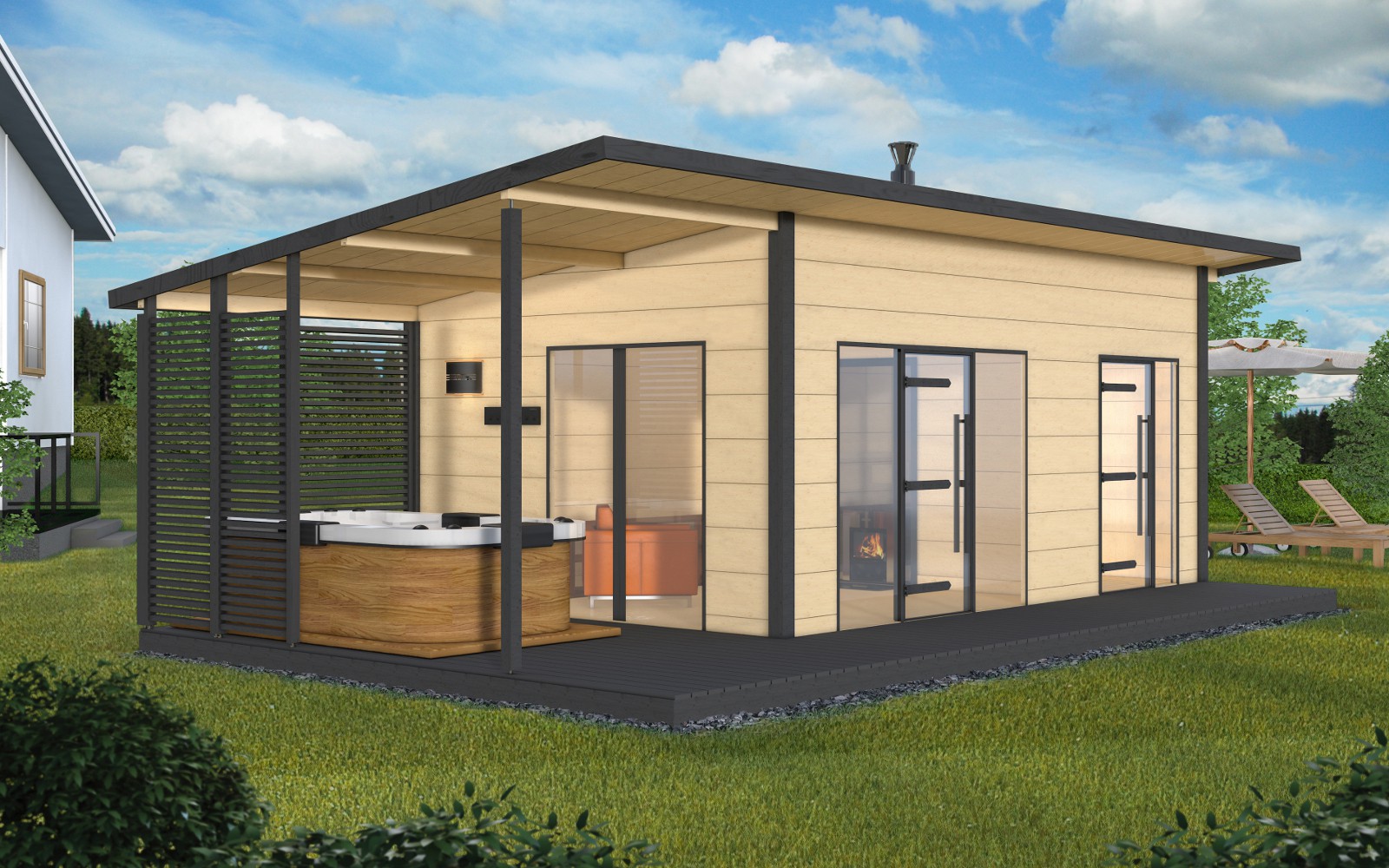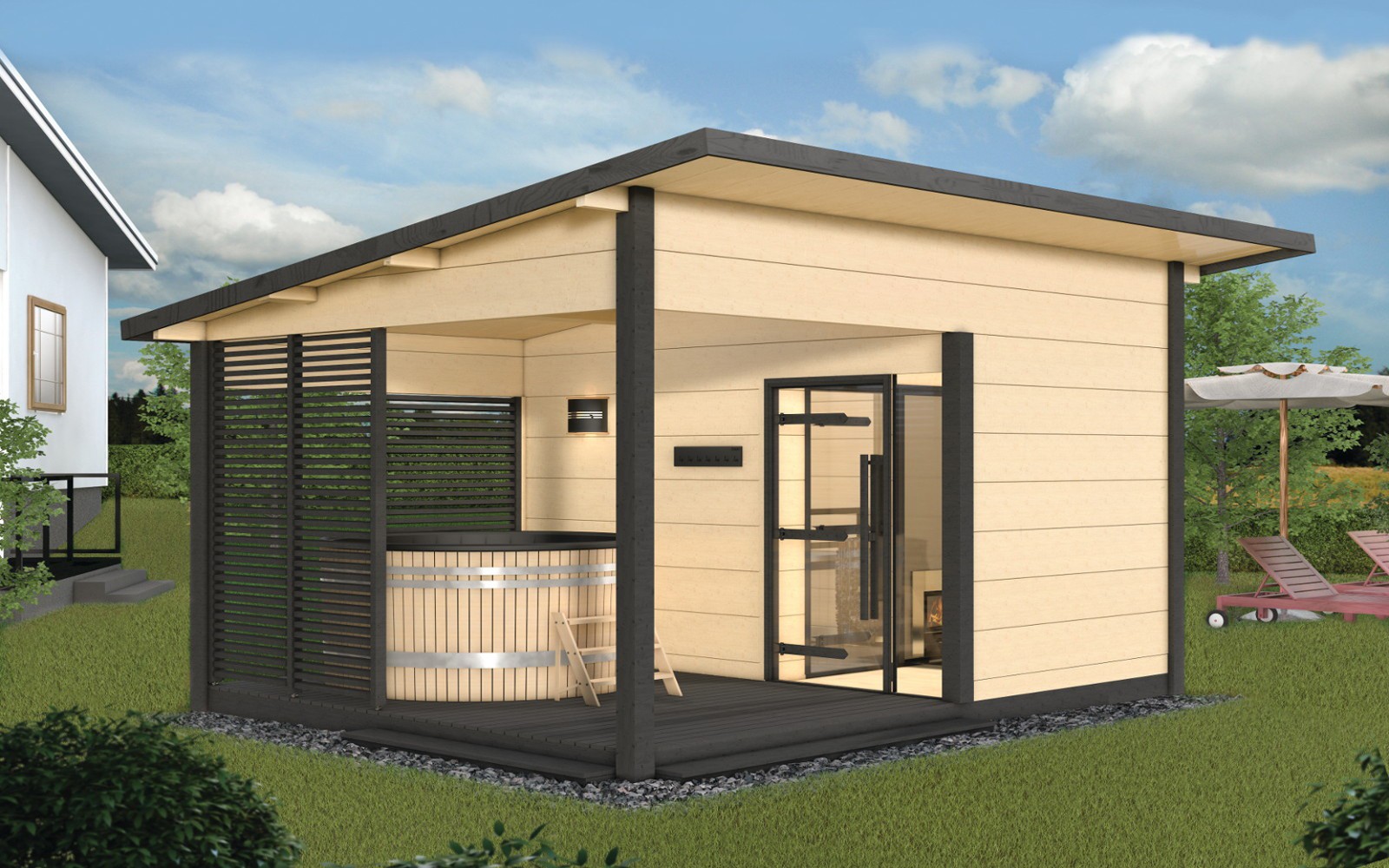 Эта модель сауны – легкая в монтаже конструкция, которая устанавливается без фундамента. Она включает парную, помещение для переодевания и открытую террасу.