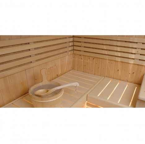 В базовой комплектации сауны S1212 бренда Harvia предусмотрен интерьер Variant Formula из абачи. В стоимость сауны входят электрическая печь Harvia Delta D36, камни Harvia 20 кг и набор аксессуаров для сауны.