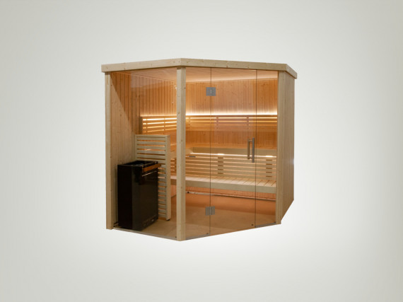 Эта сауна имеет полностью стеклянную фронтальную стену. Большая площадь остекления визуально расширяет площадь и избавляет от ощущения замкнутого пространства. И внутри, и снаружи кабина светлая. Для отделки стен и потолка используется скандинавская ель. Стандартный интерьер Formula, выполненный из осины, гармонично вписывается в общий облик сауны.