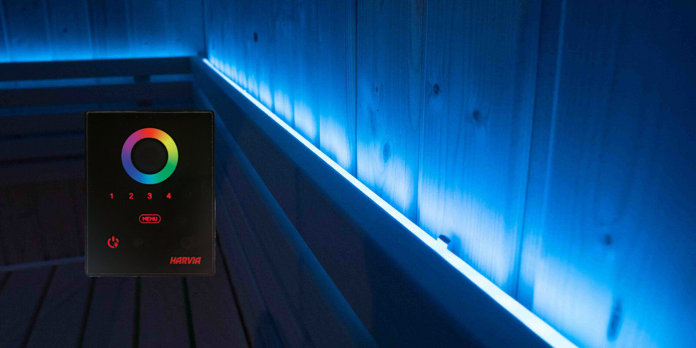 Дополнительно предлагается светодиодная система цветного света для сауны Variant View, состоящая из контроллера Xenio RGBW, драйвера для Led светильников DMX-CV, блока питания и светодиодных светильников-трубок, устанавливаемых на стену за опору для спины и под нижний полок.