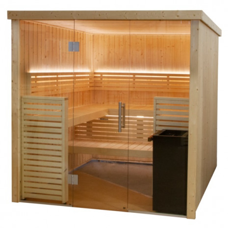 Эта сауна имеет полностью стеклянную фронтальную стену. Большая площадь остекления визуально расширяет площадь и избавляет от ощущения замкнутого пространства. И внутри, и снаружи кабина светлая. Для отделки стен и потолка используется скандинавская ель. Стандартный интерьер Formula, выполненный из осины, гармонично вписывается в общий облик сауны.