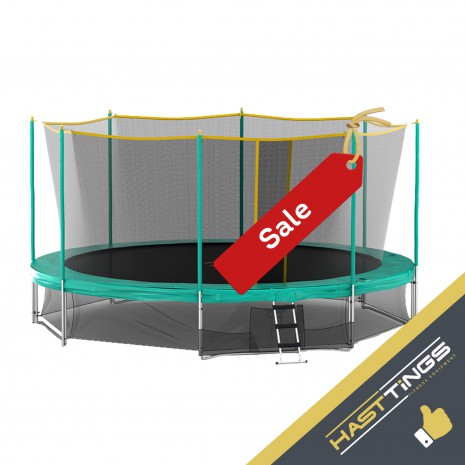 Одна из самых популярных моделей батутов от Hasttings. Изготовленный из качественных материалов и обладающий высоким уровнем безопасности, батут Hasttings 14ft (4,26 м) доставит Вам массу удовольствия от занятий на свежем воздухе независимо от того, являетесь Вы опытным прыгуном или только осваиваете этот тренажёр! С 2012 года модель претерпела несколько модернизаций из-за особенностей применения. И сейчас большие 14-футовые батуты также укомплектованы нижней защитной сетью для обеспечения более высокого уровня безопасности. Комплект Hasttings 14ft (4,26 м) состоит из батута, защитной сетки, удерживающей на батуте и препятствующей выпадению, лесенки от земли до прыжкового полотна, нижней защитной сетки.