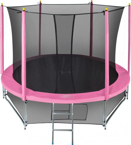 Батут ярко-розового цвета выглядит очень ярко и может привлечь внимание детей, заставляя их забыть о компьютерах предпочитая им активный отдых на свежем воздухе.