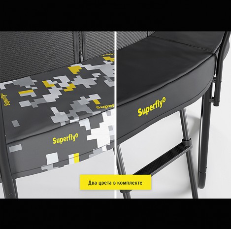 Дизайн внешнего вида. Защитный мат имеет двухстороннюю конструкцию, что позволяет переворачивать мат, меняя дизайн батута. Для одной стороны батута используется цветовое решение Digital Como, которое представляет собой же цифровой камуфляж, а для другой стороны выбран дизайн Black classic, который представлен просто классическим черным цветом.