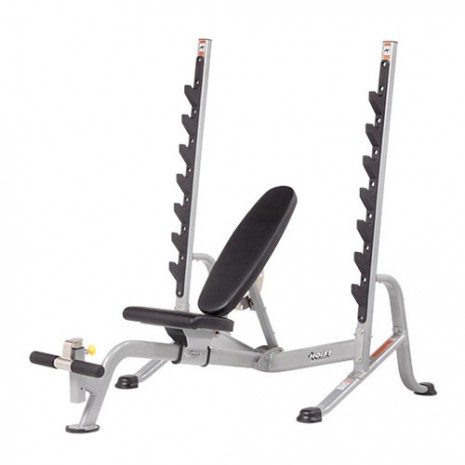 Олимпийская скамья HF-5170 бренда Hoist имеет регулируемую конструкцию: наклон спинки изменяется в диапазоне от -10° до +75° и устанавливается в семи фиксированных положениях, что позволяет выполнять жимы в различных вариантах.