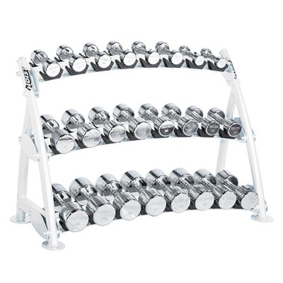 Три яруса для хранения 12 пар гантелей.