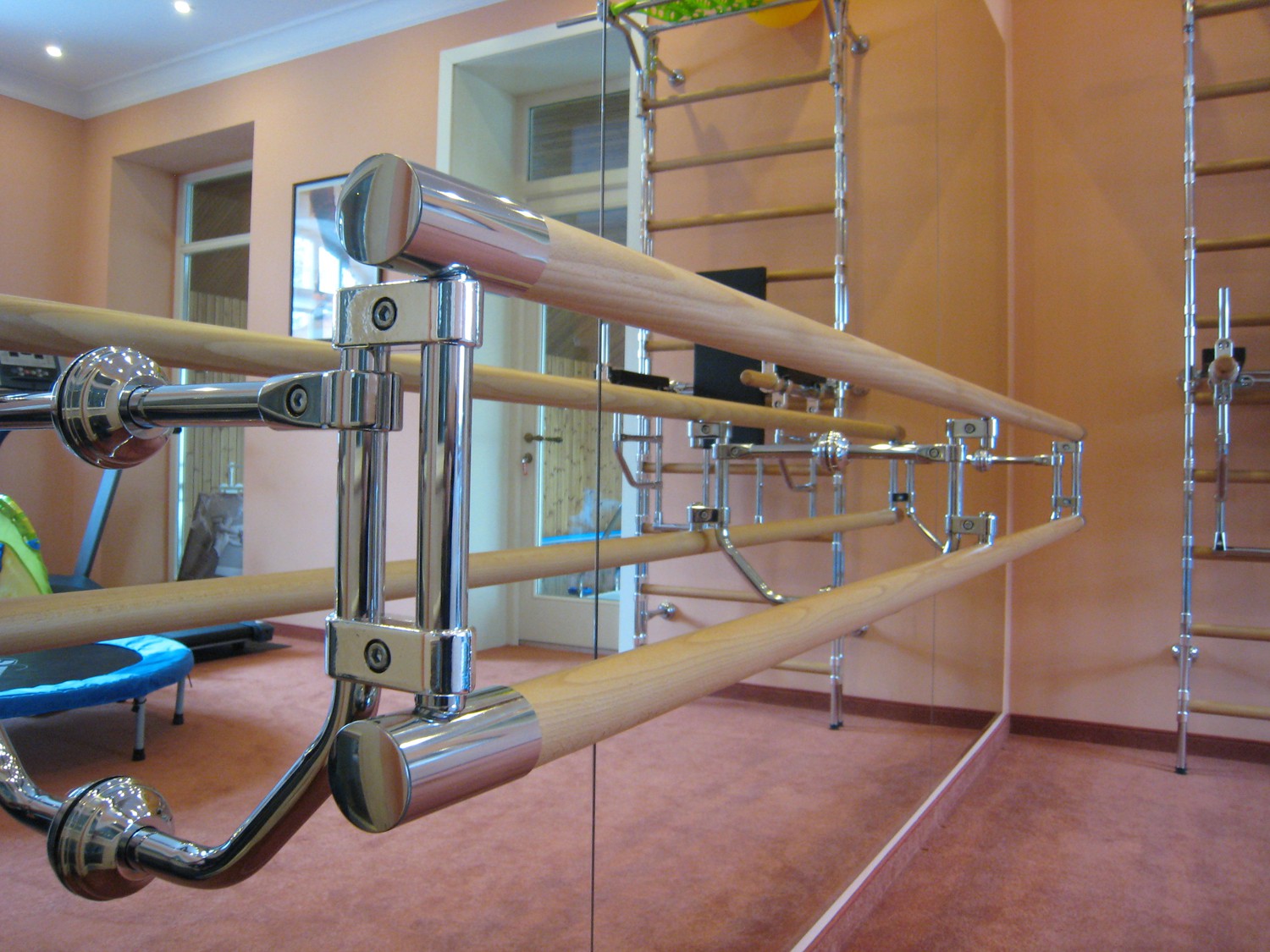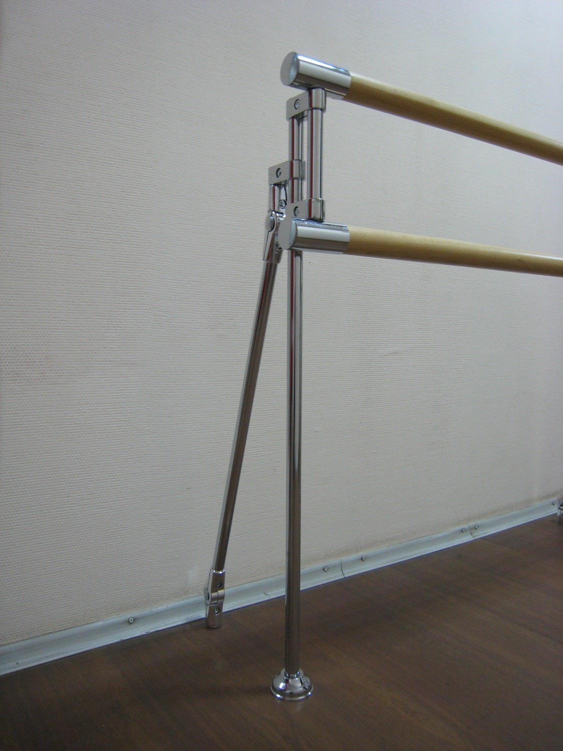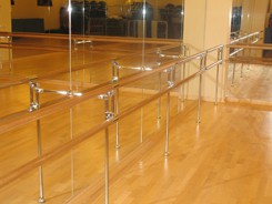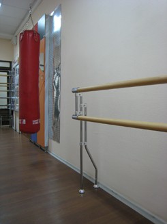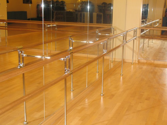 Для производства хореографических станков наша компания использует лучшие материалы и комплектующие. Опоры и крепления выполнены из хромированной трубы, перекладины диаметром 47 мм из твердо-лиственных пород дерева.