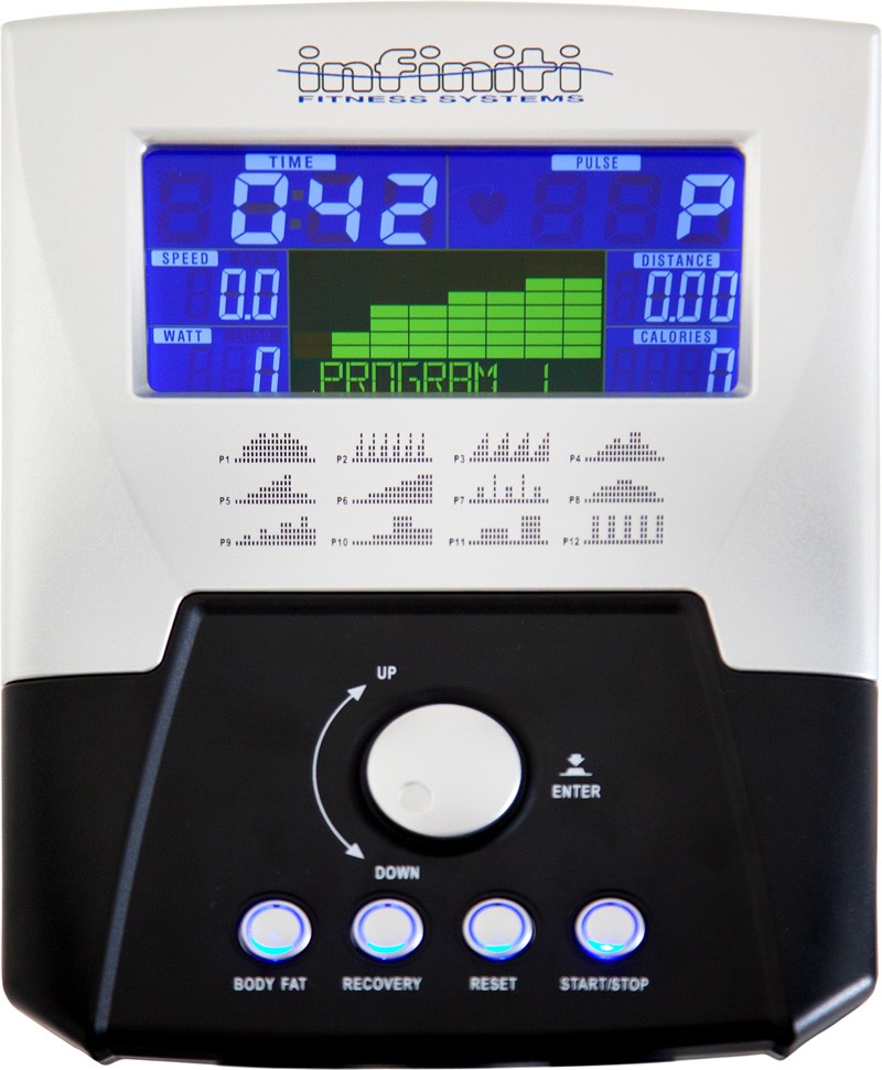 Компьютер нового поколения поддерживает 12 программ с возможностью сохранения 4 пользовательских профилей. На большом цветном дисплее можно увидеть все показатели тренировки – время, дистанцию, уровень нагрузки, расход энергии и калорий, частоту пульса, которую измеряют датчики на неподвижных рукоятях. Для лучшей нагрузки всех групп мышц имеются подвижные рычаги с большой амплитудой, а функция RECOVERY подскажет, насколько хорошо организм справляется с нагрузкой.