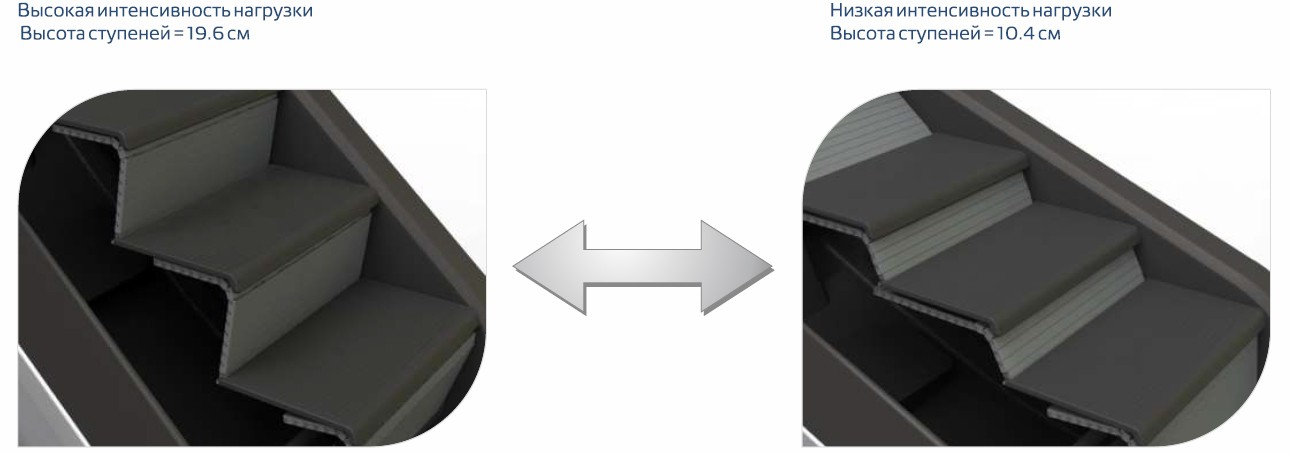 Меняющаяся с помощью регулировки высота ступеней (10,4-19,6 см).