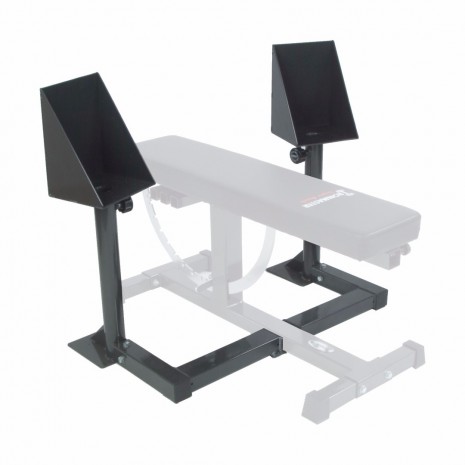 Подставки крепятся на специальной раме, которой оснащается универсальная скамья Super Bench. Подставки можно регулировать по высоте, а для крепления используются специальные фиксаторы.