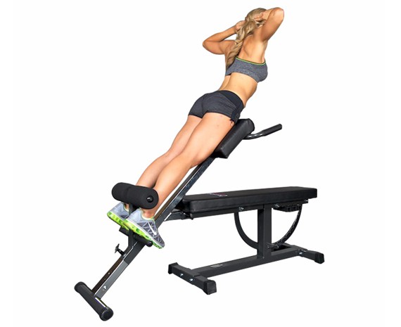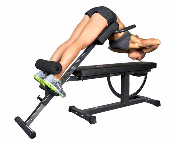 Гиперэкстензия обеспечивает движения тела в диапазоне до 90°. Для дополнительной нагрузки можно выполнять упражнения с дисками или гантелями.