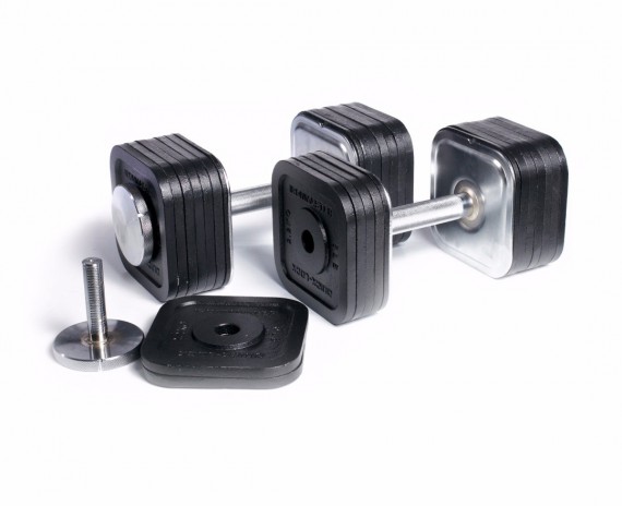 В наборных гантелях могут использоваться дополнительные комплекты дисков, что позволяет увеличить вес каждой гантели до 54 кг или до 75 кг.