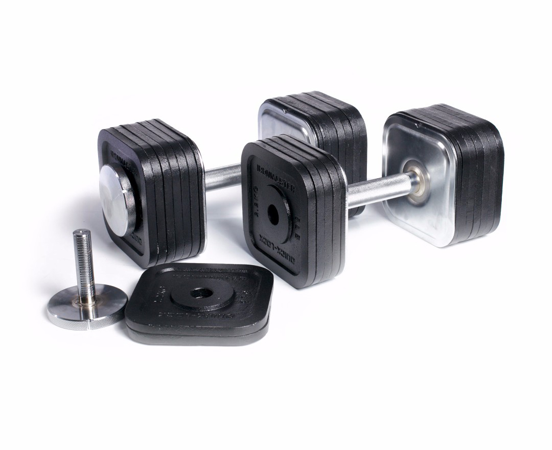 Эти наборные гантели имеют гораздо более удобную конструкцию, чем аналоги со стандартными фиксаторами, и по ощущениям они похожи на гантели с фиксированным весом. Большим преимуществом является отсутствие пластмассовых деталей, за счет чего они являются монолитными и сбалансированными. В гантелях используются диски и замки, которые совместимы с рукояткой Ironmaster.