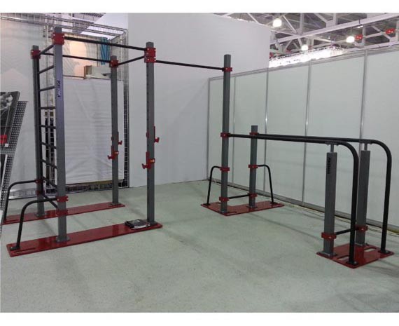 Система металлических стоек в единый комплекс объединяется различными турниками: рукоход, брусья, шведские стенки.