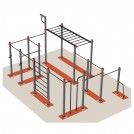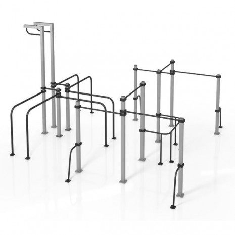 Система металлических стоек в единый комплекс объединяется различными турниками: рукоход, брусья, шведские стенки.