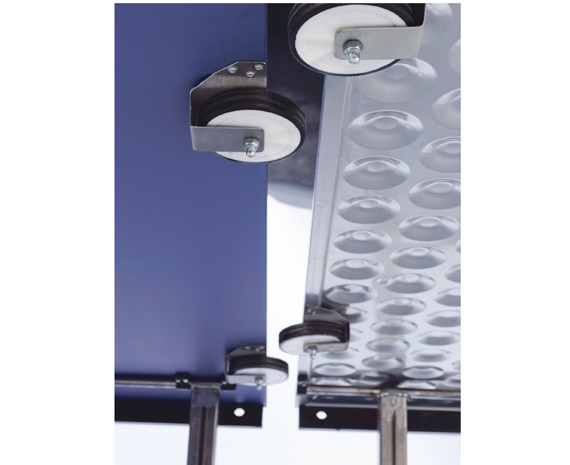 Модель оснащена 4-мя транспортировочными колесами, с помощью которых стол можно легко перемещать с одного места в другое. При этом 2 колеса, которые располагаются по диагонали, оснащены тормозными блокираторами для дополнительной устойчивости изделия.
