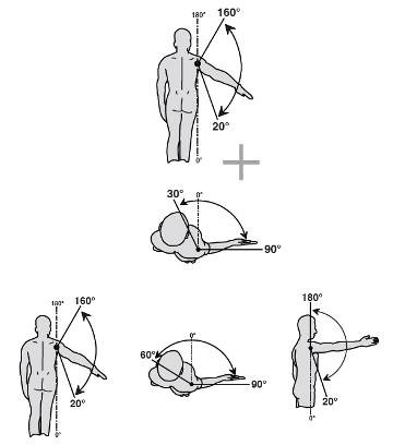 Отведение/приведение плеча с синхронизированным вращением. Общий диапазон 20°–160°.