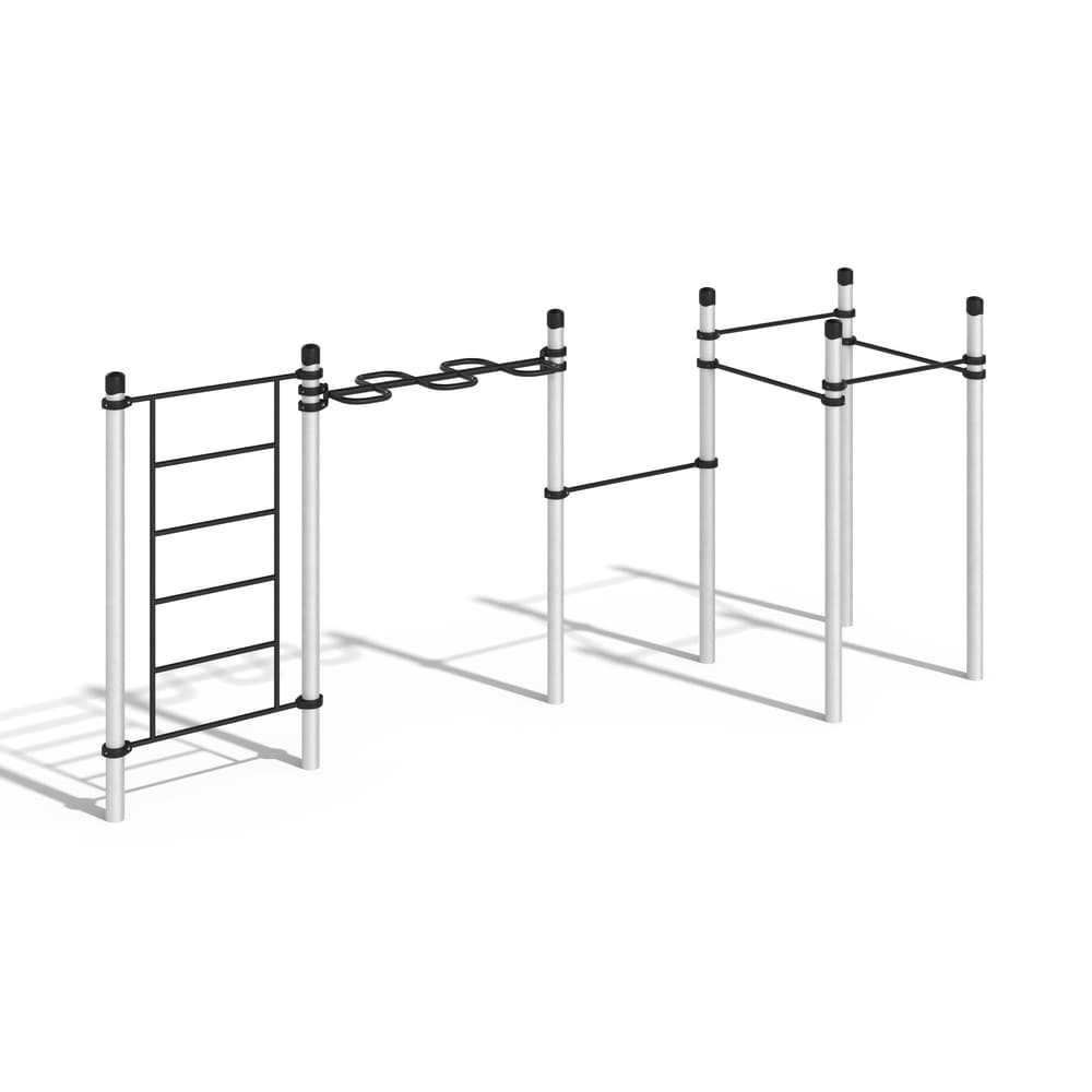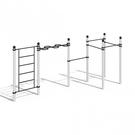 Комплекс состоит из семи опорных столбов высотой 2600 мм, пяти перекладин для подтягиваний длиной 1200 мм, рукохода-змеевика и шведской стенки. Элементы крепятся к опорным столбам при помощи хомутов. Высота фиксации перекладин для подтягиваний: 1 шт. – 2300 мм, 1 шт. – 2200 мм, 2 шт. – 2100 мм, 1 шт. – 1400 мм. Рукоход-змеевик длиной 1758 мм расположен на высоте 2300 мм. Шведская стенка крепится на высоте 2450 мм. Состоит из перекладин, расстояние между которыми 373 мм. Высота шведской стенки - 2073 мм, ширина - 1200 мм. Длина комплекса не более 5900 мм.