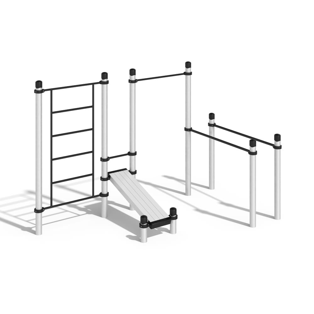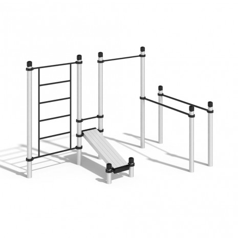Комплекс состоит из девяти опорных столбов высотой: 4 шт. - 2600 мм, 3 шт. - 1500 мм, 2 шт. - 400 мм, перекладины для подтягиваний длиной 1200 мм, шведской стенки, брусьев, и наклонной скамьи. Элементы крепятся к опорным столбам при помощи хомутов. Высота фиксации перекладины для подтягиваний 2400 мм. Шведская стенка крепится на высоте 2450 мм. Состоит из перекладин, расстояние между которыми 373 мм. Высота шведской стенки - 2073 мм, ширина - 1200 мм. Жерди брусьев представляют собой 2 горизонтальных перекладины длиной 1758 мм, высота их фиксации 1300 мм. Расстояние между центрами опорных столбов брусьев 600 мм. Наклонная скамья для упражнений на пресс крепится на высоте: 700 мм в верхней части и 275 мм в нижней части от поверхности основания. Длина комплекса не более 4000 мм.