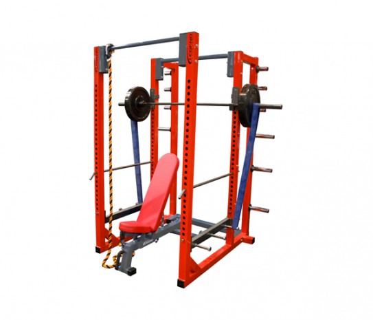 На стойках крепятся мощные сварные крюки для фиксации штанги.