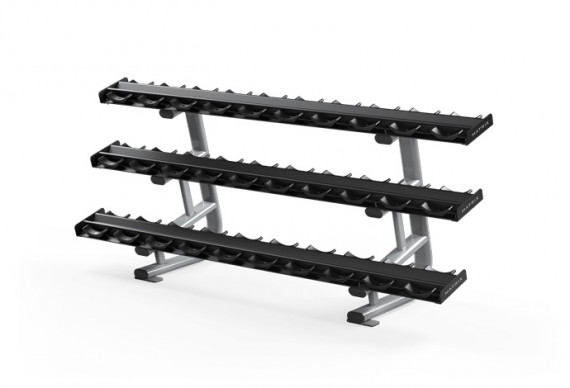 Удобная трехъярусная стойка с горизонтальной конструкцией обеспечивает пространство для хранения 15-ти пар гантелей профессионального типа весом до 68 кг.