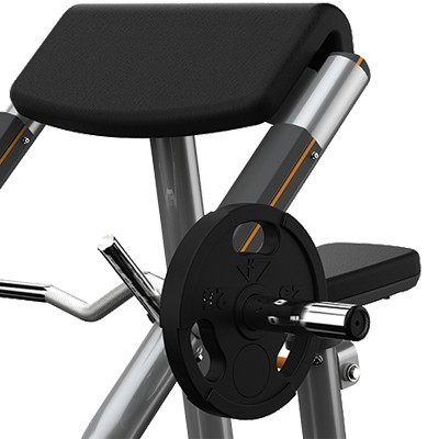 Ультрапрофессиональная скамья Скотта (в положении сидя). Конструкция скамьи выполнена из мощного профиля, она способна выдерживать работу даже с самыми большими весами. Рама скамьи имеет двухслойную окраску и покрытие лаком. Место, где гриф контактирует с профилем, металл имеет защиту в виде насадок из формированного уретана.