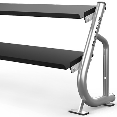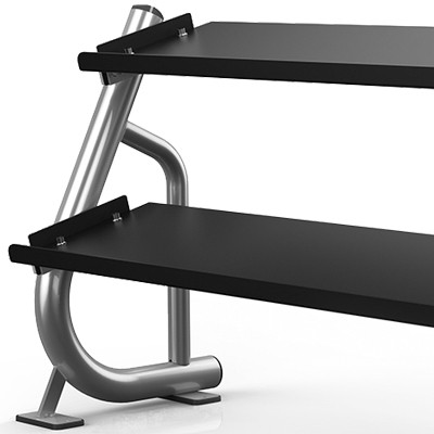 Устойчивость агрегата обеспечивается за счет продуманного дизайна. Изделие состоит из двух плоских ярусов длиной 1,8 метра и рассчитано для хранения шестигранных гантелей весом 24.9 - 45.4 кг. или 2.3 - 22.7 кг. комплектаций. Компактность подставки позволяет удобно поместить ее даже в маленьком помещении.