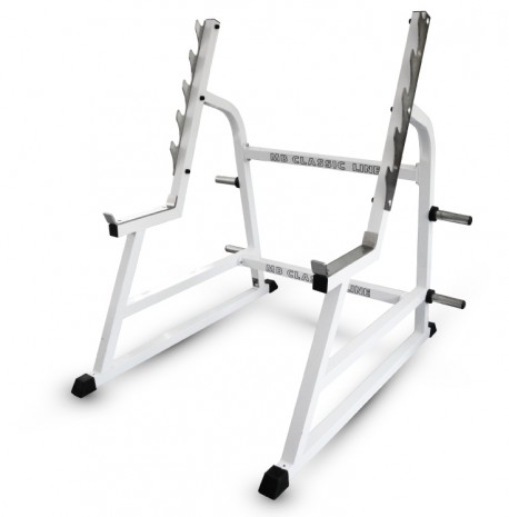 Пять пар хромированных упоров позволяют спортсмену выбрать такую высоту размещения штанги, которая наиболее подходит его собственному росту. Для того, чтобы штангу, установленную на любой высоте, было одинаково удобно брать – поверхность стойки, на которой размещены упоры для штанги, выполнена наклонной. Для удобного хранения олимпийских дисков, которые в данный момент не надеты на штангу – на раме стойки MB 2.18 бренда МВ Barbell предусмотрены четыре держателя, пригодных для размещения на них дисков с диаметром посадочного отверстия начиная от 50 мм.