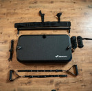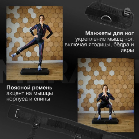 Комплектация фитнес-платформы: Фитнес-платформа, Натяжной трос *1, Карабин*4, Перекладина-гриф * 1, Рукоятка*2, Ремень-удлинитель для троса *2, Поясной ремень *1 Манжеты для ног * 2, ЕВРО кабель питания, инструкция, Шестигранный ключ. Мощность двигателя - 12W. Bluetooth- фиксация активности через MERCAH app.