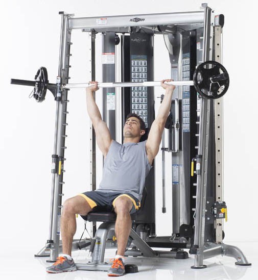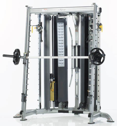 Направляющие грифа расположены под углом в 7 градусов, за счет чего достигаются максимально естественные движения при выполнении упражнений. Утяжеленные линейные подшипники обеспечивают абсолютно плавный ход грифа. Алюминиевый гриф имеет рифленые насечки, что гарантирует удобный и надежный хват. Тренажер оснащен специальными крюками, при помощи которых гриф удерживается в 15 положениях. Для беспрепятственного использования кроссовера гриф крепится в самой верхней позиции.