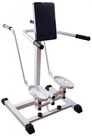 Основой конструкции тренажера является рама из металлического профиля толщиной 2 мм: в несущей части – прямоугольного сечения 50х50 мм, вспомогательные – овального сечения. Металл окрашен при помощи порошковой технологии, что делает покраску долговечнее и менее опасной с санитарно-гигиенической точки зрения. Для недопущения травм концы профиля защищены заглушками из ПВХ. Из этого же материала исполнены насадки на рукояти для сохранения равновесия и подпятники на ножки, препятствующие скольжению тренажера и защищающие пол от царапин. Для опоры спины с целью снижения нагрузки и большего удобства предусмотрена 18 мм спинка из пятислойной фанеры с полиуретановой подушкой, обитой кожезаменителем. Крепится спинка при помощи болтов в одной из 14 фиксированных позиций согласно росту пациента.