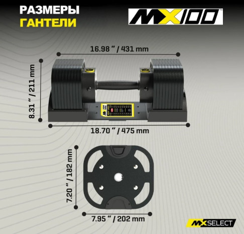 Комплектация 2 гантели MX100 EVO с подставками Тип рукояти Прорезиненная, эргономичная Материал корпуса Сталь Материал дисков Сталь с порошковым покрытием Механизм выбора веса Сталь Материал подставки Полиамидный нейлон Диапазон веса, кг 5,9-45,4 Шаг смены веса, кг 4,45/2,26/1,14 (с доп.дисками) Длина рукояти, см 15,2 Длина общая (мин-макс), см 24,3-43,1 Диаметр рукояти, мм 36 Габариты макс, ДхШхВ, см 43,1×20,2×18,2 Общий вес 1 гантели в подставке, кг 48,3 Гарантия, лет 2 Размер упаковки, Д×Ш×В, см 49,5×27,5×30 Вес в упаковке, кг 49,5 Объем упаковки, м3 0,041