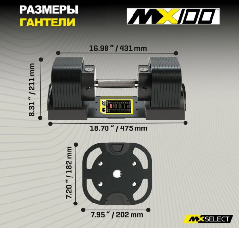 Комплектация 1 гантель MX100 EVO и подставка Тип рукояти Рифлёная сталь, классическая Материал корпуса Сталь Материал дисков Сталь с порошковым покрытием Механизм выбора веса Сталь Материал подставки Полиамидный нейлон Диапазон веса, кг 5,9-45,4 Шаг смены веса, кг 4,45/2,26/1,14 (с доп.дисками) Длина рукояти, см 15,2 Длина общая (мин-макс), см 24,3-43,1 Диаметр рукояти, мм 29 Габариты макс, ДхШхВ, см 43,1×20,2×18,2 Общий вес 1 гантели в подставке, кг 48,3 Гарантия, лет 2 Размер упаковки, Д×Ш×В, см 49,5×27,5×30 Вес в упаковке, кг 49,5 Объем упаковки, м3 0,041