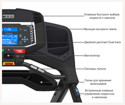 На беговой дорожке установлен высокоинтеллектуальный ЖК-дисплей с простым управлением и технологией DualTrackTM. Уникальный двойной экран позволит получить доступ к любому трек-листу при этом общие показатели тренировки останутся доступными для обозрения.